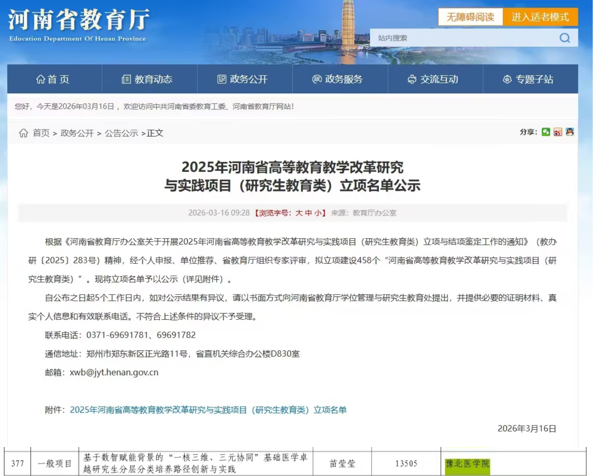 近日,河南省教育厅发布《2025年河南省高等教育教学改革研究与实践项目(研究生教育类)立项名单公示》,我...