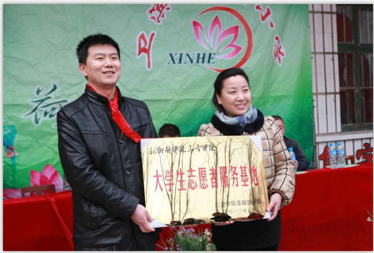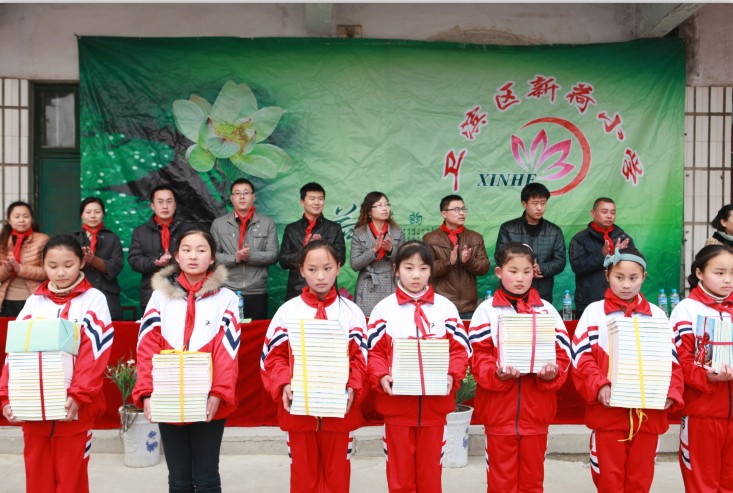 2013年3月26日下午4点,新乡市市委志愿者工作部部长贾紫亮,共青团卫滨区委副书记田炜,卫滨区教文体局教育科科长吴哲川,卫滨区教文体局团委书记朱丽娜,卫滨区文明办公室主任白杨,感动中原十大人物孙建洲,我院团委书记王俊萍,基础医学院党总支书记李健,团委副书记张新,基础医学院全体老师以及随行的志愿者们一同来到新荷小学捐赠图书并举行授牌仪式。新乡电视台和教育电视台也对本次活动进行拍摄。
