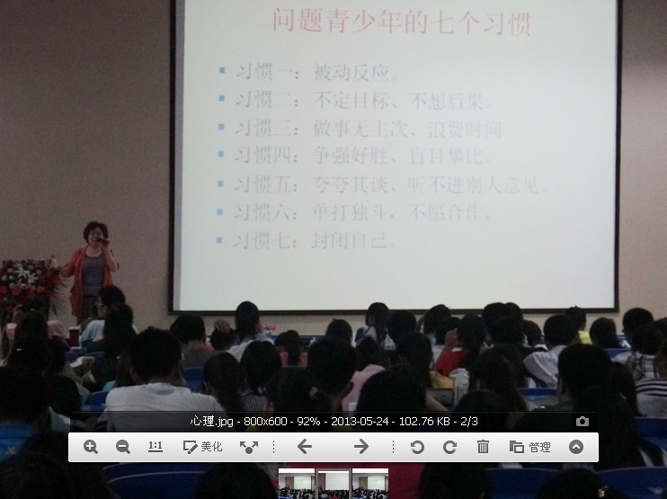 此次讲座历时2个小时,此次讲座,使同学们更为深刻了解个人行为习惯与命运的关系,提高同学们自身素质,促进心理健康发展。