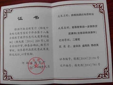 最近又从教育部获悉,三全学院在第十四届全国课件大赛共推荐的10件作品全部获奖,其中6件为基础医学院教师作品;在三全学院挺进全国决赛的2件作品中,其中一件就是我院王秀菊、王曼曼、翟沙沙的《亲核取代反应》;微课组我院盛海燕、李曼丽、金白洁的微课《蛙类坐骨神经--腓肠肌标本的制备》连贯精练,并在较短时间内突破难点、突出最亮点,更是获得微课程最高奖二等奖;我院金白洁、盛海燕、陈改英的《跨膜物质转运》亦凭借其原创模板、动画等并巧妙融合了自身专业特色获得课件组优秀奖。本次我院在全国第十四届课件大赛中取得优异成绩是继新乡医学院三全学院第五届教育教学信息化大赛和河南省第十八届教育教学信息化大奖赛之后的又一里程碑。