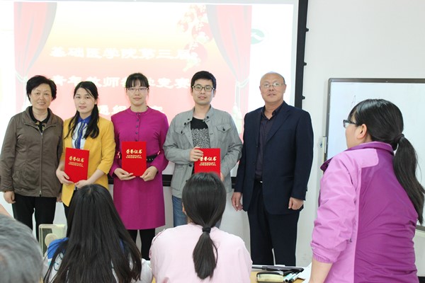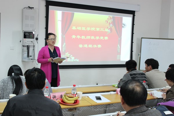 为提高我院中青年教师整体教学水平,并选拔优秀人才参加三全学院第四届青年教师教学竞赛,基础医学院在4月28日上午8:20基础楼B403教室,继双语组总决赛之后,隆重举办基础医学院第三届中青年教师教学竞赛普通组总决赛暨教学竞赛的颁奖仪式。本次总决赛的评委为校督导组组长杨文亮教授、督导组成员刘巨源教授、岳莜萍教授、护理学院院长薛松梅教授、三全学院教师发展中心主任李东亮教授等。