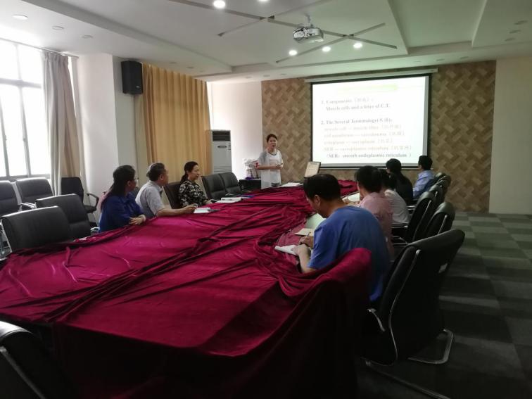 2018年5月8日上午9:30组织学与胚胎学教研室在基础楼二楼会议室,开展了组织胚胎学双语教学预示讲,魏慧平老师是本次授课主讲人,讲授内容是心脏和骨骼肌,教研室主任韩金珠主持了本次预示讲。基础医学院副院长李勇莉、生物与基础医学实验教学中心主任李长正、督导组马振江、王俐、孙玉华教授旁听了此次授课。