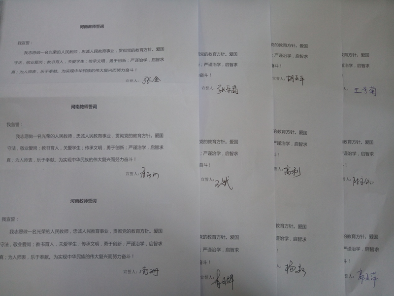 大家一起诵读了有关教师的诗词,对此感慨颇多!大家纷纷表示:将在以后工作中严格要求自己,以更高的热情投入教育事业中!会上大家重温《河南教师誓词》,以宣誓和签名的形式强化大家教书育人的荣誉感和责任感!(文/郭亚萍 图/王亚娟)