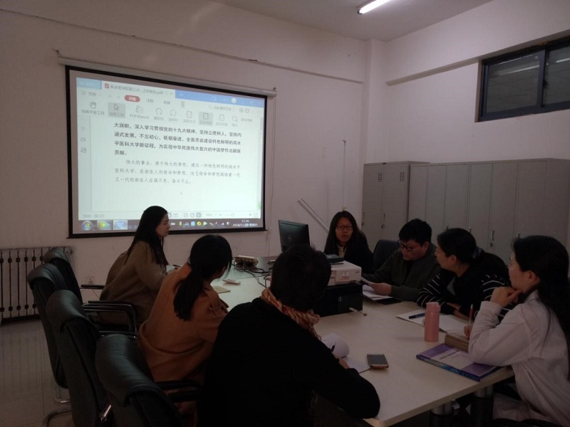 1月10日上午,基础医学院党总支职工第二党支部在基础医学院A306会议室开展了以“习主席2019新年贺词:我们都是追梦人”为主题的政治理论学习活动。此次活动由支部书记袁欢欢主持,支部全体党员教师参加。