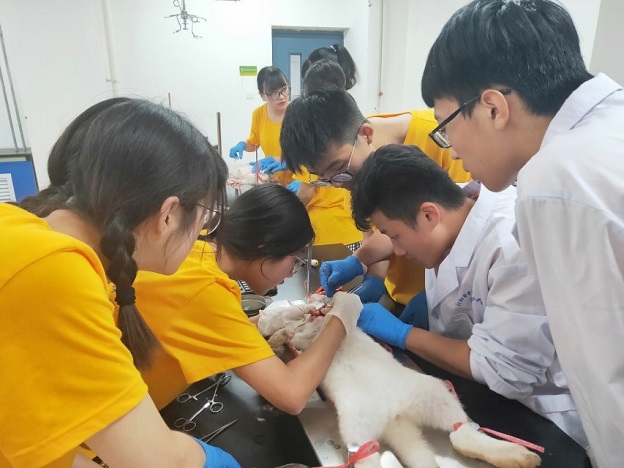 接着由郭美霞老师指导大家进行实验设计和操作。郭老师亲自动手教授大家进行家兔实验的基础操作和实验仪器的正确使用方法。在郭老师精心指导下,大家学会了如何寻找家兔的颈总动脉、减压神经等。整个实验队员们投身其中,乐在其中。
