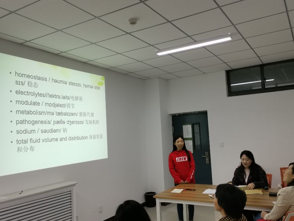 首先,王晓娜老师带领大家学习了《水、电解质代谢紊乱》章节的医学英语词汇,也给大家分享了医学英语词汇的词根组成,这让带有前后缀、词形冗长、构词复杂的医学英语词汇变得相对简单易记。为了使发音标准,大家反复诵读,并相互交流了学习经验。学习结束后,孙主任为了检验各位老师的学习情况,对每位老师都进行了提问,王晓娜、武辉、崔唱、王祎丽以及李凡老师依次翻译了“水、电解质代谢紊乱”、“酸碱平衡的调节机制”、“钾代谢紊乱”、“体液从细胞内向细胞外转移”和“组织液大量丢失”,她们对应的英语翻译如下:”Water, electrolyte metabolic disorders”,”Regulatory mechanism of Acid-base balance ”,”Kalemia disturbance”,”Fluid transfer from cell to extracellular”,”A lot of tissue fluid loss”,孙主任逐一进行了点评。