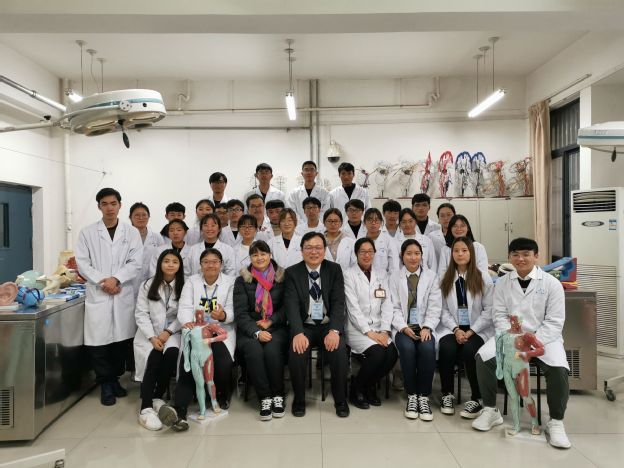12月9日, 在基础楼的第二解剖实验室,台湾元培医事科技大学国际暨两岸事务处副国际长匡思圣,台湾健康管理学会秘书长林淑芳及5名学生一行到访基础医学院交流。元培医事科技大学的师生走进了《系统解剖学实验课》的课堂,与2019级临床2班的全体学生共同学习--淋巴动物实验。本次的主讲人是基础医学院人体解剖学教研室教师苗莹莹老师。