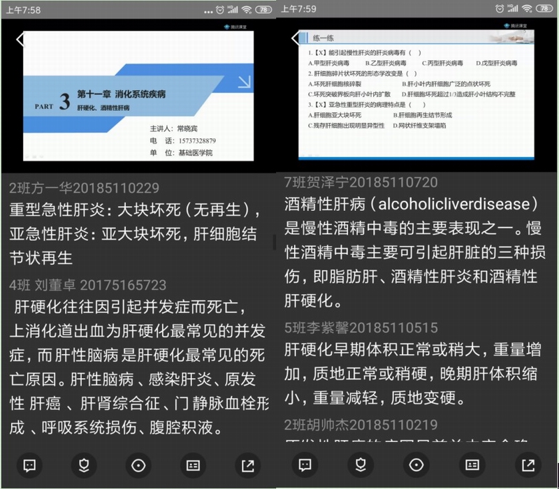 常晓宾老师的课堂设计是“以疾病为中心”、以“执业医师考试”为目标。首先,在课前,筛选用于课堂教学的临床病例,通过长江雨课堂发送至学生,要求学生在课前对病例进行分组讨论,鼓励学生生成讨论报告。在课上,利用“腾讯课堂”引导学生积极分享讨论结果以及相关学科知识点,并将优秀的病例分析报告分享给全体学生学习。同时,在授课过程中以“执业医师考试”大纲的重点内容为授课重点,而且将病理学和生物化学、免疫学和组织胚胎学等相关学科知识融会贯通。而对于简单的内容由学生自学完成,并通过测试题检测学习效果。这种授课方式不仅通过自主学习使学生掌握了基本知识,而且通过小组协作学习拓展了学生的医学知识,初步培养学生临床思维,为学生以后临床课的学习奠定了坚实的基础。