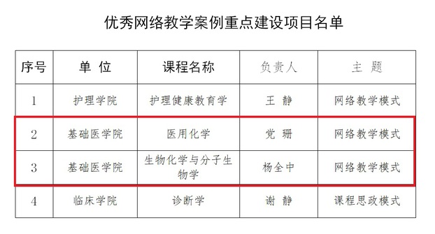 基础医学院的老师们经过紧张筹备、精心设计、积极申报,最终,化学教研室郭亚萍老师主持的《有机化学》和党珊老师主持的《医用化学》,生化教研室杨全中老师主持的《生物化学与分子生物学》、组胚教研室魏慧平老师主持的《组织学与胚胎学实验》、病原生物学与免疫学教研室赵晓会老师主持的《微生物学与免疫学》共5项教学案例,入选我校优秀网络教学案例,数量位居全校院系获奖数量首位,其中《医用化学》和《生物化学与分子生物学》获得优秀网络教学案例重点建设项目。(文/图 党珊 谢永生)