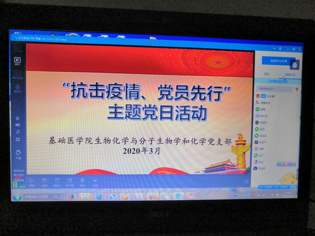 当前,国内新型冠状病毒肺炎形势有所缓和,但国外新型冠状病毒肺炎形势严峻。为进一步发挥党组织战斗堡垒和党员先锋模范作用,提高全体党员的思想认识和自我防范能力,生物化学与分子生物学和化学党支部于3月31日组织了“抗击疫情,党员先行”主题党日活动,该活动主要通过腾讯课堂和企业微信进行开展。