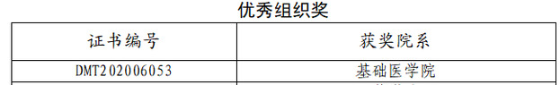 新乡医学院三全学院文件院教〔2020〕6号《新乡医学院三全学院关于公布第十一届教育教学信息化大赛结果的通知》,新乡医学院三全学院第十一届教育教学信息化大赛按照预定方案和规定程序,经各教学单位选拔推荐、专家评审、院务会审定,基础医学院有12件作品获各组不同级别奖项,另有基础医学院获大赛优秀组织奖。