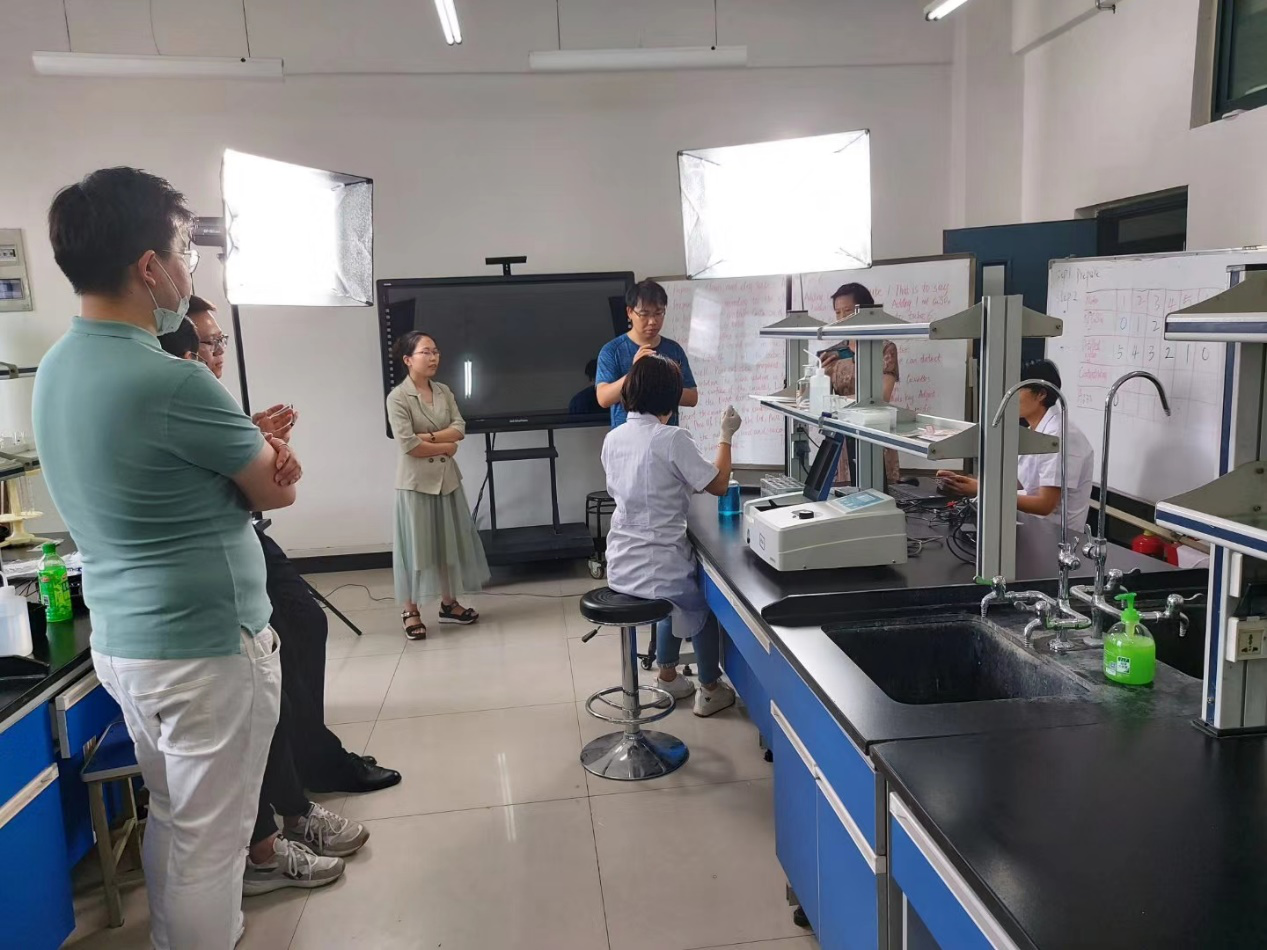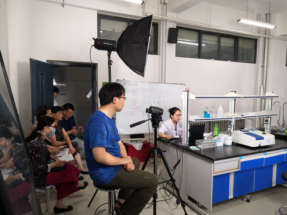 6月18日是生化教研室第一次为留学生直播授课的日子,为了能够正常直播,并在直播过程中不出现问题,生化教研室的老师提前对设备进行了调试,并进行反复的演练。当天,外事部的同事和生化教研室的老师们早早的来到实验室,再此对设备进行调试,灯光、镜头,甚至每一个动作都是精心设计的。直播开始,邓青老师熟练的打开设备,并用流利的英语先讲解了实验的理论部分,期间不断和同学们进行互动。理论讲解结束,开始实验操作部分,邓老师熟练的切换镜头到实验室,杨全中老师操作摄像机对准实验设备,程远芳老师已经站在实验仪器旁边时刻准备着。和同学们打招呼,介绍仪器,讲解操作,演示实验,一切都在顺利进行,期间不断和同学们进行互动交流,操作结束最后是实验总结和答疑。同学们对此次的授课表现了前未所有的热情,直呼太赞了!直播结束后,所有的老师都松了一口气,并连夜进行开会总结第一次直播中的经验和不足,为下一次直播做好准备。