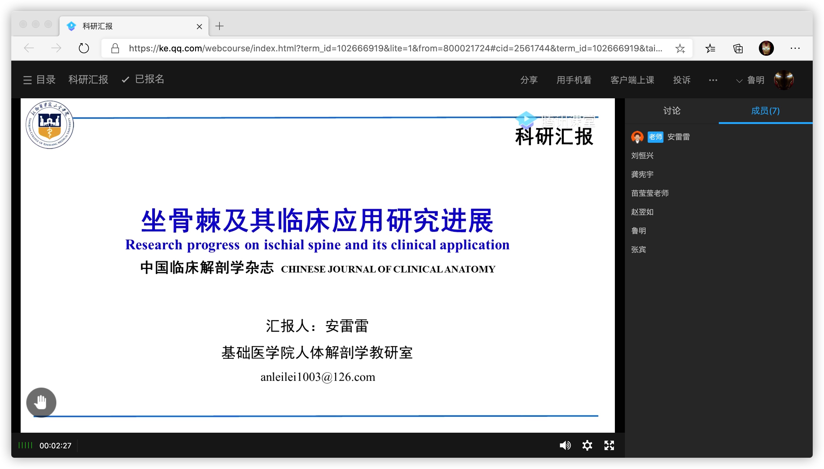 2020年6月17日下午,人体解剖学教研室进行集体科研活动,会议由科室副主任鲁明主持。全体老师通过线上平台聆听了安雷雷老师的科研汇报,并对相关问题进行了研究讨论。科室主任刘恒兴教授出席活动并做了总结。