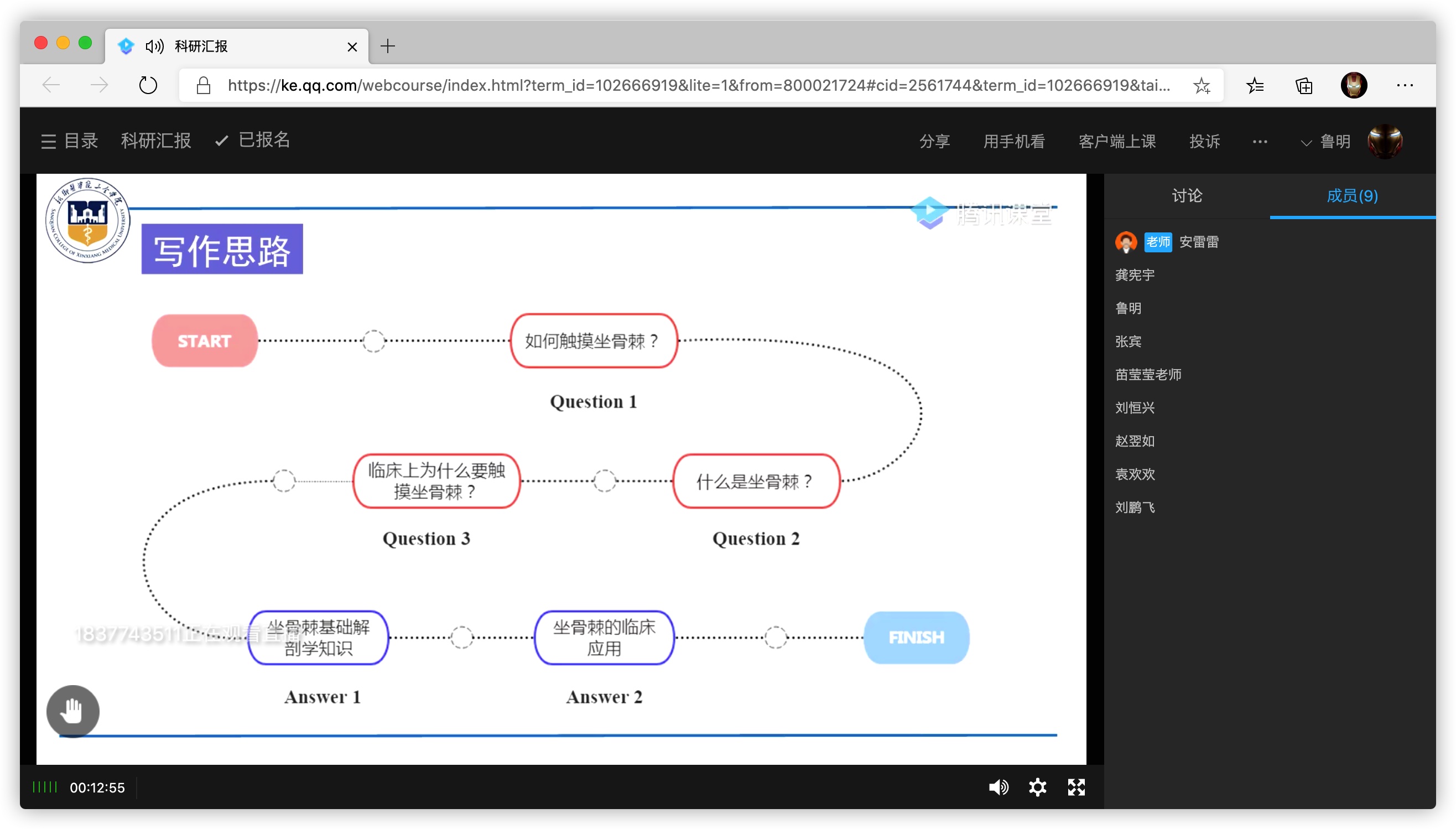 安雷雷老师以“坐骨棘及其临床应用研究进展”为题,对相关知识的背景、写作思路、文献查询进行了讲解。报告之后,老师们论文中的一些思路和方法进行了深入的交流,有多位老师表示通过报告受到了很多启发,比如论文的思路及命题的选择方向,多位老师表示很感兴趣,希望可以在自己的研究中利用相关知识。