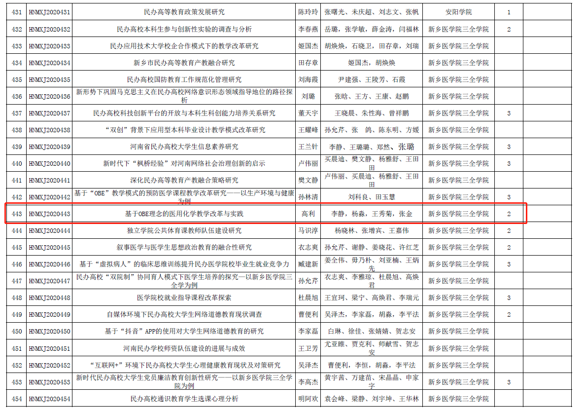 年河南省民办教育协会研究课题结项工作完成,我院高利老师主持的项目“基于OBE理念的医用化学教学改革与实践(HNMXJ