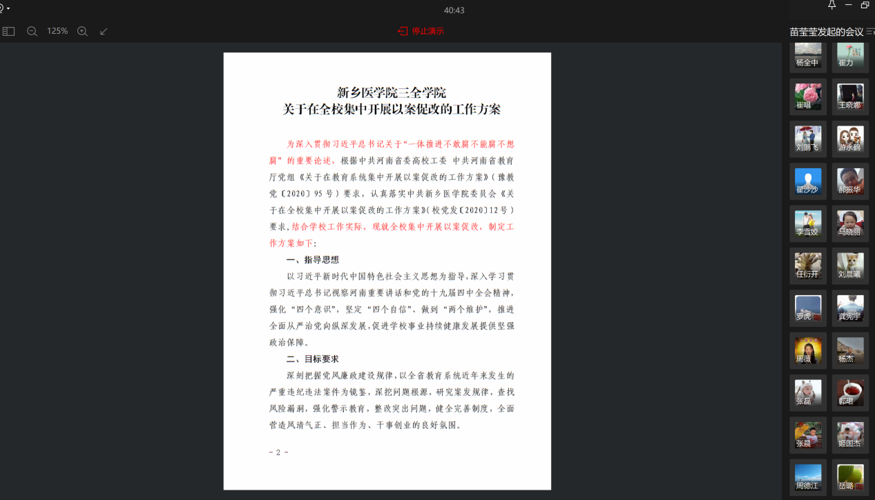 为深入贯彻习近平总书记关于“一体推进不敢腐不能腐不想腐”的重要论述,根据中共河南省委高校工委 中共河南省教育厅党组《关于在教育系统集中开展以案促改的工作方案》和《新乡医学院三全学院关于在全校集中开展以案促改的工作方案》的相关要求,我总支于8月15日上午利用企业微信线上组织全体党员教师“以案促改党员工作动员会”。