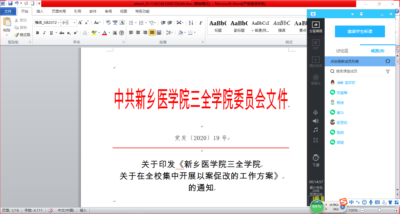 根据河南省教育厅下发的“以案促改” 文件精神,基础医学院党总支人体解剖学、组织胚胎学与病理学党支部积极响应上级党组织要求,8月15日上午九点半,在党支部书记袁欢欢同志的主持下,全体党员通过腾讯课堂平台开展线上“以案促改专题工作学习讨论会”。