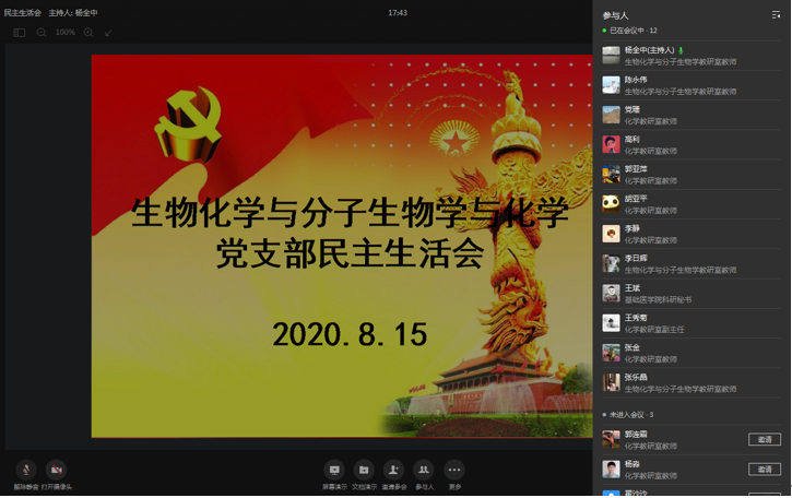 我支部于8月15日下午6点通过企业微信线上召开民主生活会,会议由党支部书记杨全中主持召开,支部全体党员参加此次会议。首先,党支部书记杨全中关于持续进行以案促改学习做出一下三点要求:一是全体党员自我学习警示案例撰写心得体会,并按时提交报送;二是全体党员要在思想上高度重视,参加我支部组织召开的阶段性学习活动;三是全体党员要实事求是地从党的领导、党的建设、管党治党责任及思想政治四个方面查摆剖析问题。