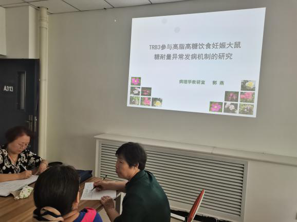 首先,郭燕老师以“TRB3参与高脂高糖饮食妊娠大鼠糖耐量异常发病机制的研究”为主题,对其从事的科研课题的设计、实施和结果讨论进行详细介绍。随后,常晓宾老师等青年教师对该科研方向提出问题,郭燕老师针对问题进行了认真解答。赵淑敏教授对于课题设计提出问题,为进一步丰富和完善课题提出宝贵的建议。最后,周玲生教授一方面对郭燕老师前期科研工作给予了肯定,另一方面,提出了后续课题延伸的新思路。