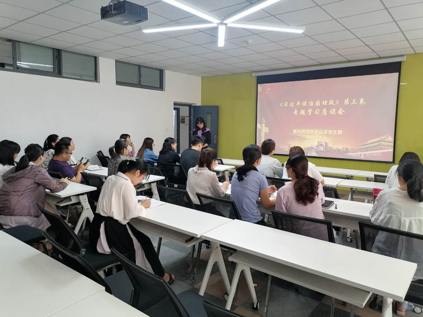 为贯彻落实中央宣传部、中央组织部《关于认真组织学习〈习近平谈治国理政〉第三卷的通知》文件要求和上级党组织的工作部署,9月17日下午4点,解剖病理病原化学党支部在基础楼A304共享学习空间组织开展以“《习近平谈治国理政》第三卷”为主题的政治理论学习活动。会议由党支部书记苗莹莹同志主持,支部全体教师参加。