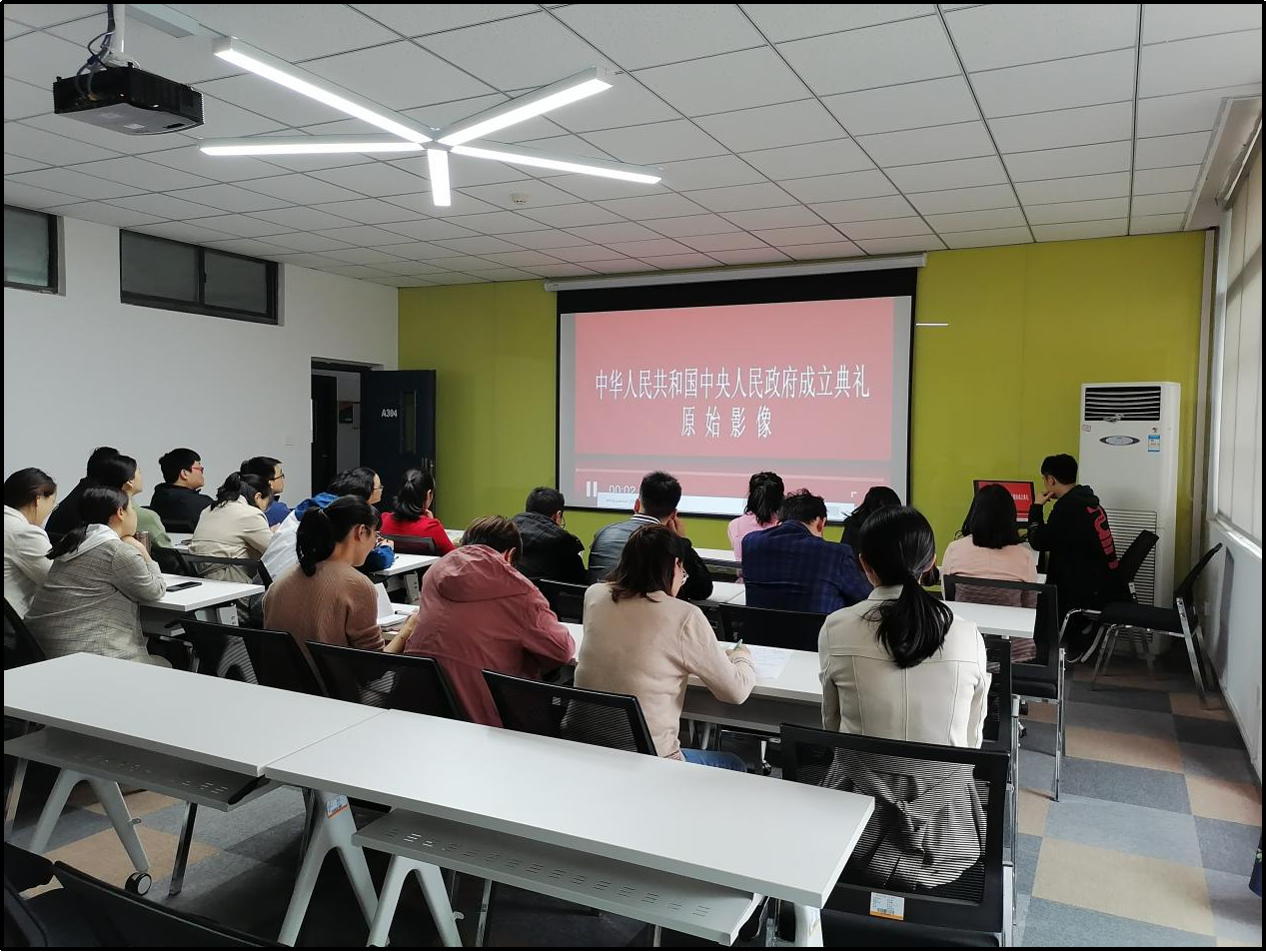 会上,苗莹莹同志带领大家共同观看了《中华人民共和国中央人民政府成立典礼原始影像》,这个珍贵的影像记录了当时重要的历史事件。由于之前大家接触到的开国大典画面都是黑白的,而这次观看的高清彩色画面让观影人员身临其境,真实还原了这一伟大的历史时刻,让人们重回1949年那激动人心的瞬间。