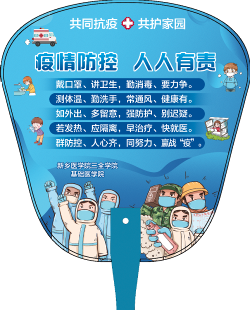 目前,学校疫情防控已进入常态化管理阶段,为提醒广大新生做好自我防护工作,基础医学院精心准备、专门定制“新冠肺炎防控宣传”小扇子,在为学生送去清凉的同时广泛宣传防疫知识。扇子正面印有“众志成城,战胜新型肺炎“几个大字及基础医学院的LOGO图标;背面印有以”疫情防控,人人有责“为主题的新型肺炎防疫短诗歌,以此形式时刻提醒大家注意防范新型肺炎病毒。学生军训完毕,老师与同学们进行了亲切交流,共同探讨医学生的使命和职责,对他们提出的就业和考研等问题一一进行答疑解惑,并叮嘱大家一定要好好照顾自己的身体,在军训期间合理调节训练和休息时间,确保人身安全和身体健康。