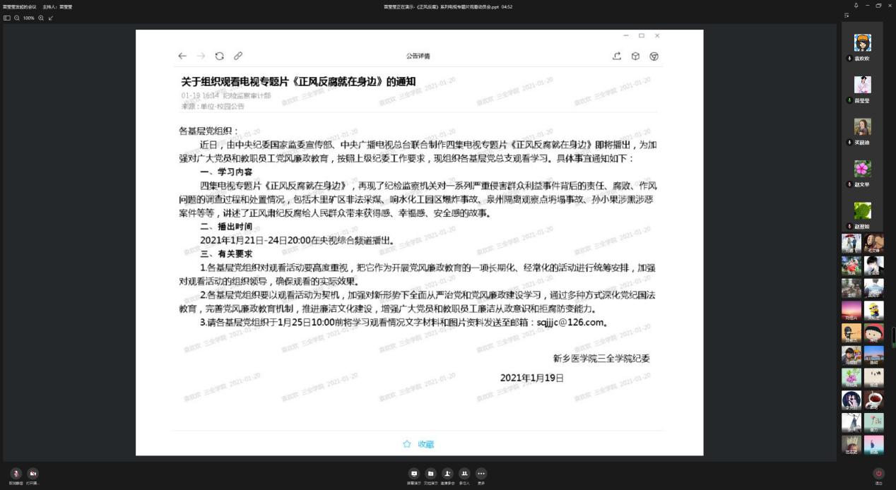 为积极响应学校纪检监察部门下发的关于组织观看电视专题片正风反腐就在身边的通知文件精神,加强新形势下全面从严治党和党风廉政建设教育,增强广大党员和教职员工廉洁从政意识和拒腐防变能力,2021年1月21日上午十点,解剖病理生理党支部利用线上平台(微协同)组织召开正风反腐系列电视专题片观看动员会,会议由支部书记苗莹莹同志主持,支部全体教师参加。