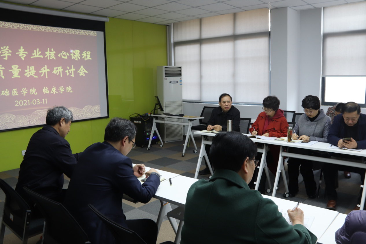 2021年3月11日下午,基础医学院和临床学院在励学楼A304召开临床医学专业核心课程教学质量提升研讨会,基础医学院主管教学、科研和行政工作的副院长及各教研室主任参会,教务部负责人杜华贞、石晓卫莅临,会议基础医学院由杨保胜院长主持。