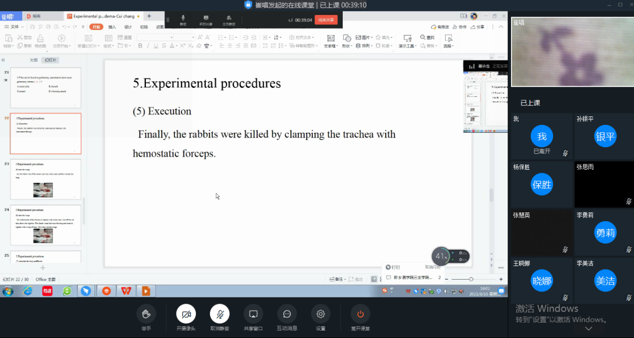 疫情阻挡了我们出行的脚步,但阻挡不了前进的脚步。为顺利开展2021-2022学年第一学期国际生的病理生理学课程教学工作, 8月10日下午,基础医学院病理生理学教研室在钉钉平台上进行了线上预试讲活动,六位教师分别进行了预试讲,本次预试讲活动由基础医学院主办,病理生理学教研室承办,预试讲由病理生理学教研室孙银平主任主持,基础医学院杨保胜院长、李勇莉副院长及病理生理学教研室全体教师参加。