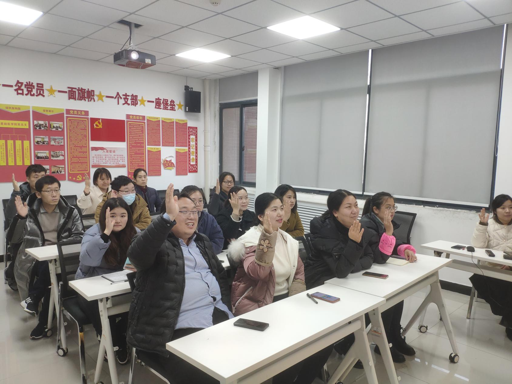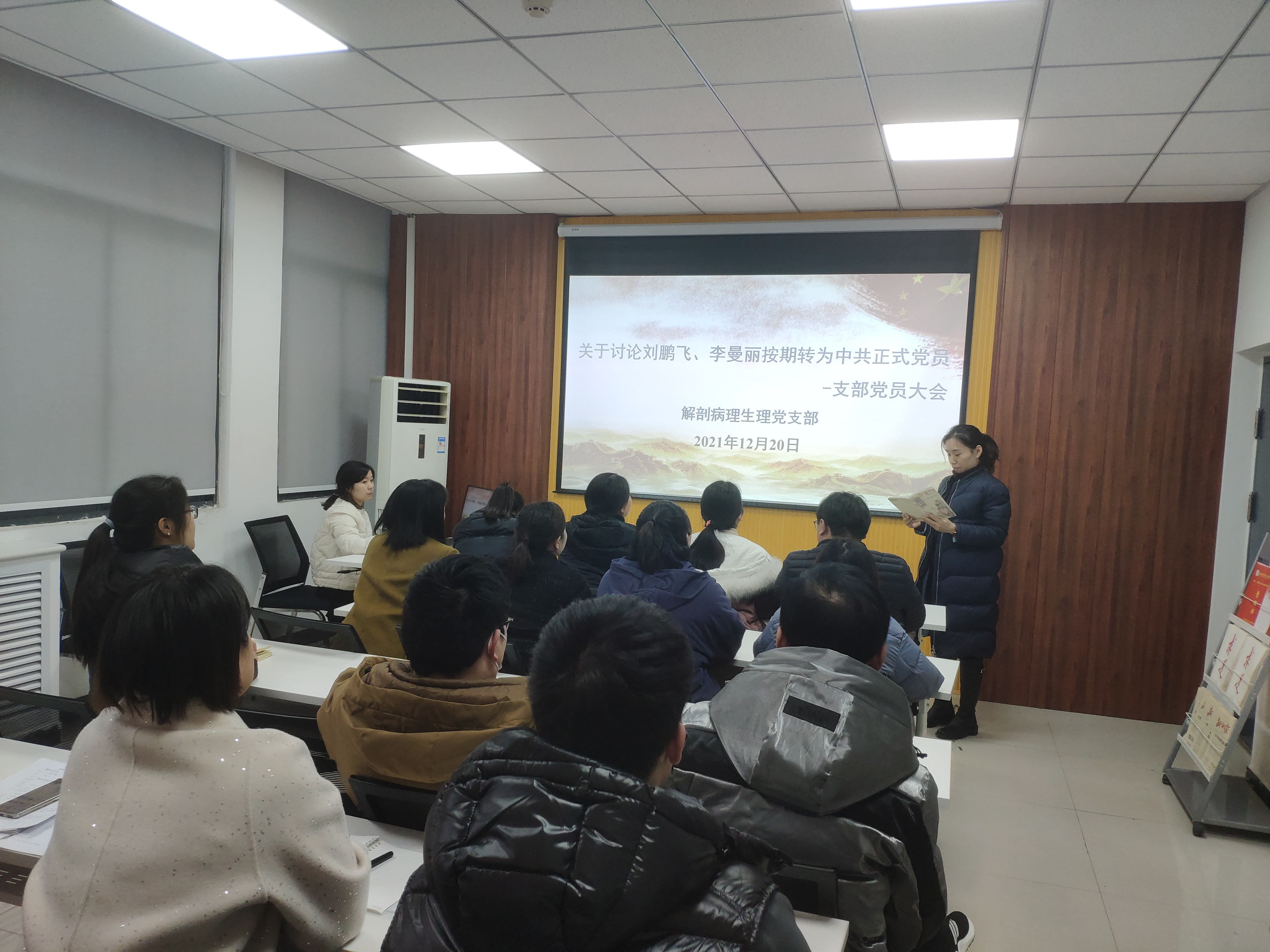 为做好发展党员工作,加强党员队伍建设,根据《中国共产党发展党员工作细则》、《新乡医学院三全学院发展党员工作实施细则》等文件精神,12月20日上午,解剖病理生理党支部在励学楼A315党员活动室组织召开支部党员大会,审议、讨论及表决两名预备党员同志刘鹏飞、李曼丽的转正相关事宜。会议由党支部副书记袁欢欢同志主持,全体党员教师参加。