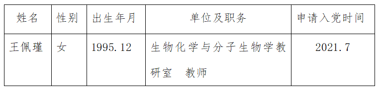 03月29日,生化病原病生党支部召开了部分党员、群众参加的入党积极分子推荐会,根据推荐结果,经支委会讨论决定,王佩瑾同志被确定为入党积极分子,为了进一步增强发展党员工作的透明度,加强民主监督,确保发展新党员的质量,根据上级有关规定,现将新推荐的积极分子名单公示如下,本公告发布后,全校及社会各界人士对公示人选如有异议,请在5个工作日内以书面(署名)或电话形式向本支部(或基础医学院党总支)、上级党委反映,反映问题应实事求是、客观公正。(文/张思雨)