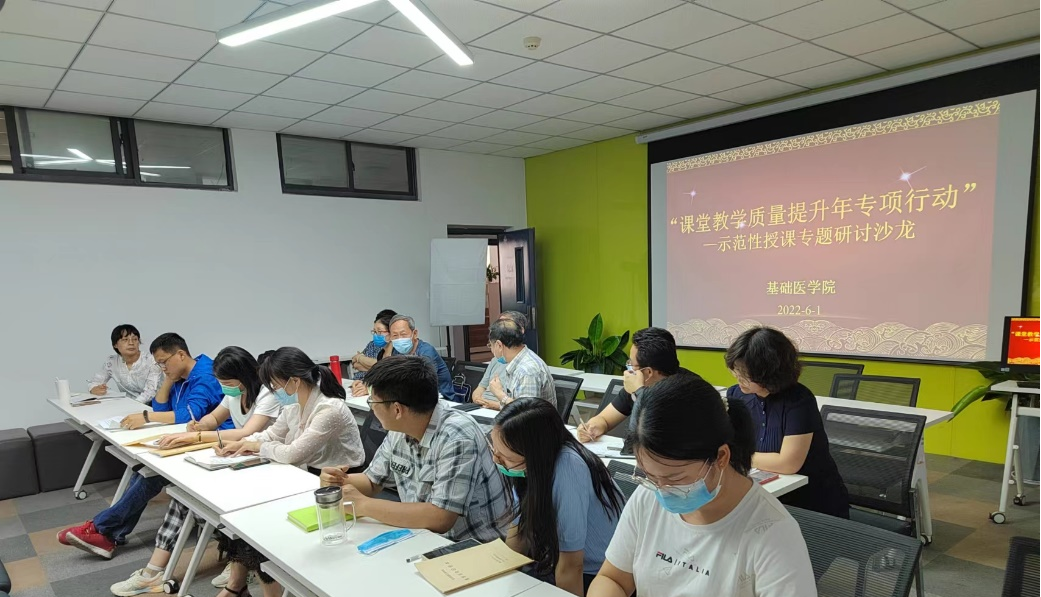 6月1日,基础医学院在励学楼A304开展示范性授课专题。会议由基础医学院教务员刘富泳老师主持,教师教学发展中心主任李东亮、校级教学督导孙玉华、基础医学院院长杨保胜和副院长张慧英以及各教研室主任、副主任和无课教师参加研讨沙龙。