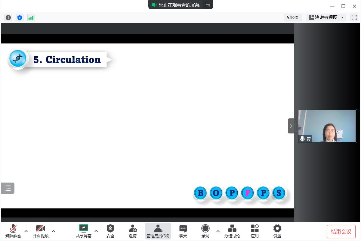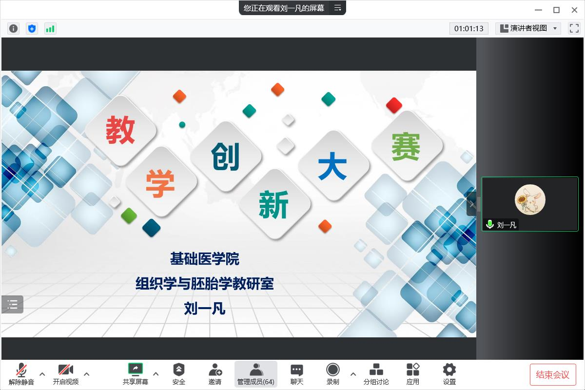 10月23日下午15时,基础医学院在腾讯会议举行线上2022年课堂教学创新大赛双语组决赛,本次决赛邀请基础医学院杨保胜教授、李勇莉教授、张慧英教授、刘长金教授和孔祥玉教授出任专家评委,我院全体教师观摩了本次决赛。