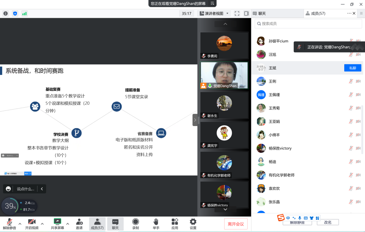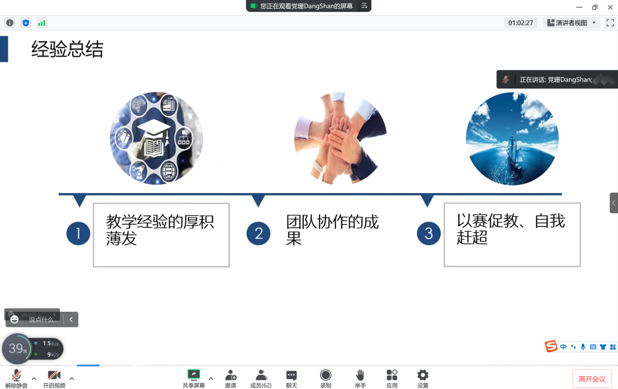 分享会分为大赛解读、备赛历程、赛场重现和经验总结四部分。首先党珊老师给教师们解读大赛文件,分享了校赛和省赛的要求和今年的规则变化,继而根据课堂教学创新大赛要求,介绍自己的备赛过程,作品设计和打磨,并展示参加校赛的说课、模拟授课和答辩环节,最后提出教学经验的积累和团队协作是教学竞赛的两个重要法宝。她深深感受到,教学大赛的历练会较快且持续加深自己对教学的认知,并把教学认知不断积淀下来,进行教学反思,不断更新自己的教学理念和改进自己的教学方法,从而提高课堂教学质量。党珊老师思路清晰,讲解细致,将自己参赛的心路历程毫无保留地跟大家进行分享,获得老师的一致好评。