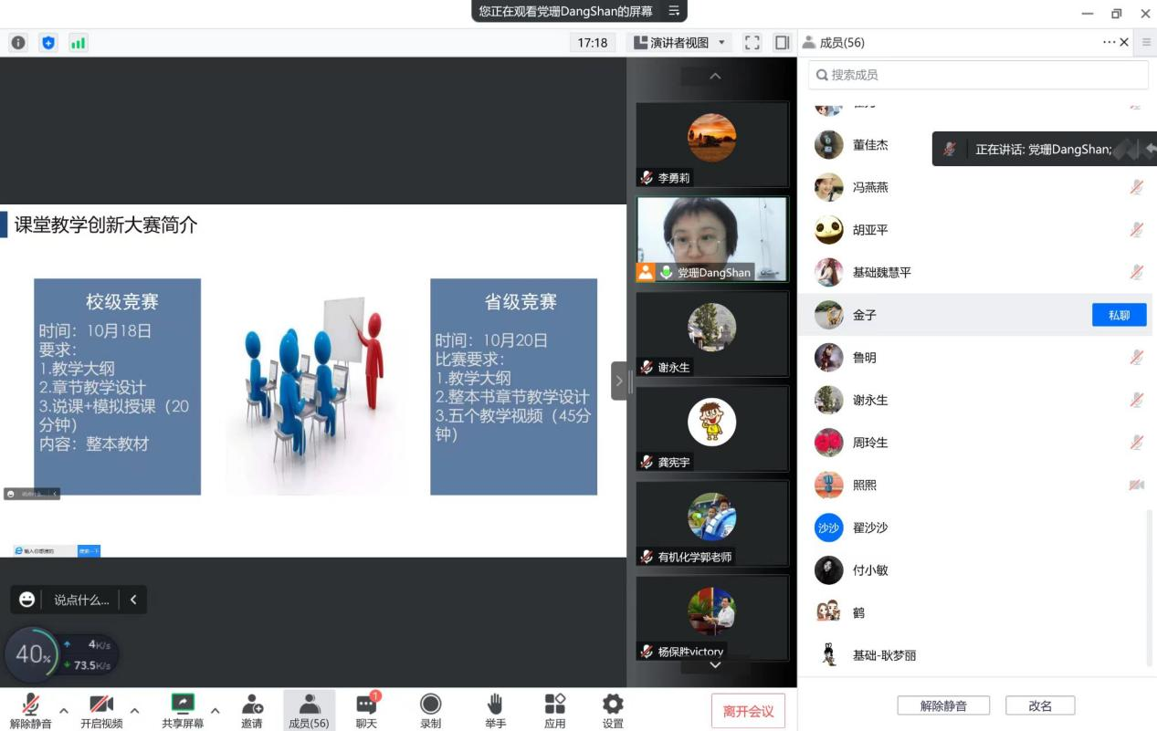 分享会分为大赛解读、备赛历程、赛场重现和经验总结四部分。首先党珊老师给教师们解读大赛文件,分享了校赛和省赛的要求和今年的规则变化,继而根据课堂教学创新大赛要求,介绍自己的备赛过程,作品设计和打磨,并展示参加校赛的说课、模拟授课和答辩环节,最后提出教学经验的积累和团队协作是教学竞赛的两个重要法宝。她深深感受到,教学大赛的历练会较快且持续加深自己对教学的认知,并把教学认知不断积淀下来,进行教学反思,不断更新自己的教学理念和改进自己的教学方法,从而提高课堂教学质量。党珊老师思路清晰,讲解细致,将自己参赛的心路历程毫无保留地跟大家进行分享,获得老师的一致好评。
