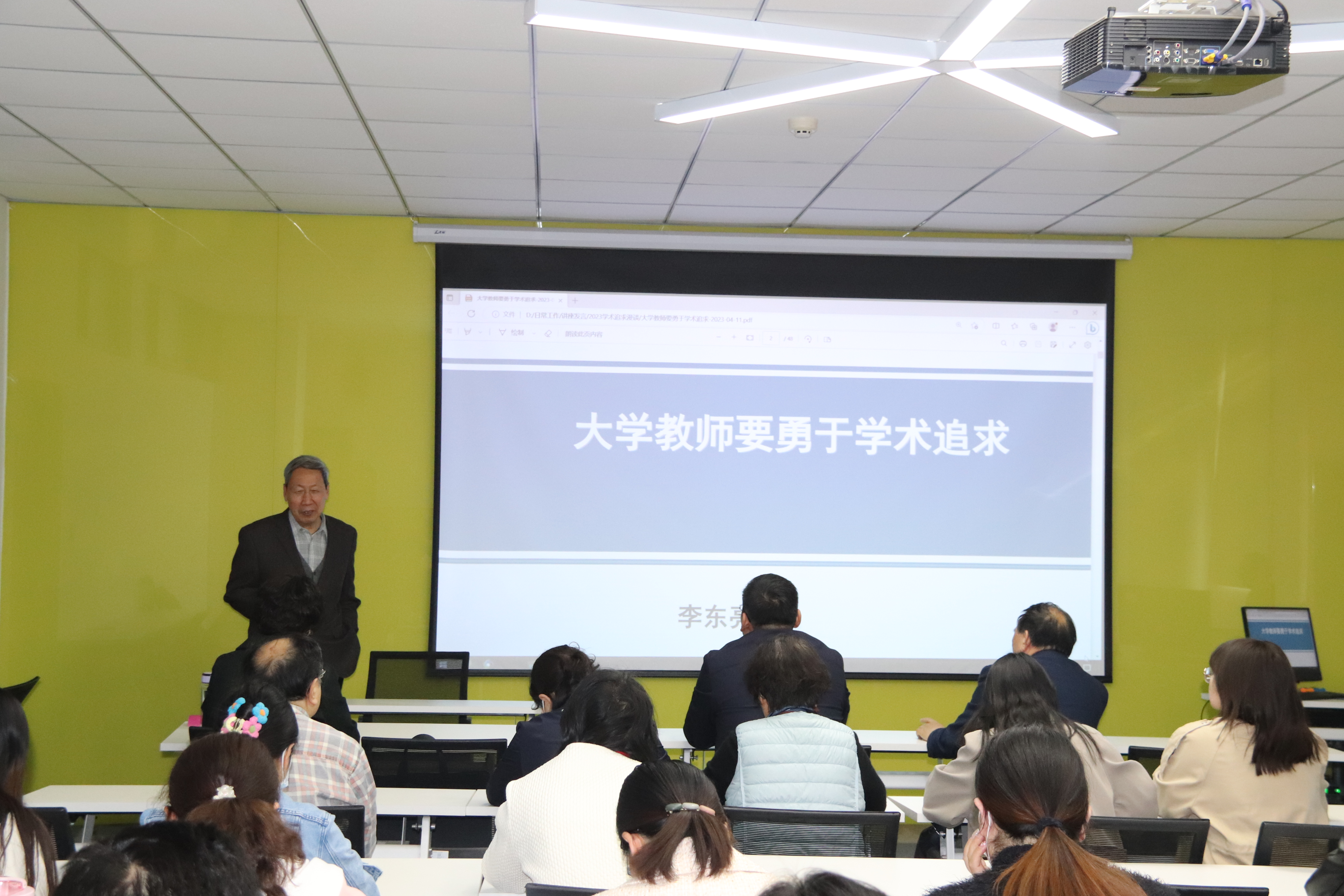 李东亮教授以他自己几十年追求学术的经历和心路历程作为主线,重点围绕“学术追求是我们的职责、学术追求从点滴做起、学术追求需要“五来”、学术追求须有三劲”四个方面,同时结合团队建立以来具体研究工作的选题思路和方法进行了详细的讲解。他在报告中引用习近平总书记“科学研究要着眼长远,不能急功近利,欲速则不达”的讲话精神,谆谆告诫青年教师从事科学研究方向要定下来、心思要静下来、身子要沉下来、性子要缓下来、意志要强起来,摈弃浮躁,静心修炼,潜心钻研,追求卓越,努力成长成为融教师、学者、教育家三位一体合格的大学教师。