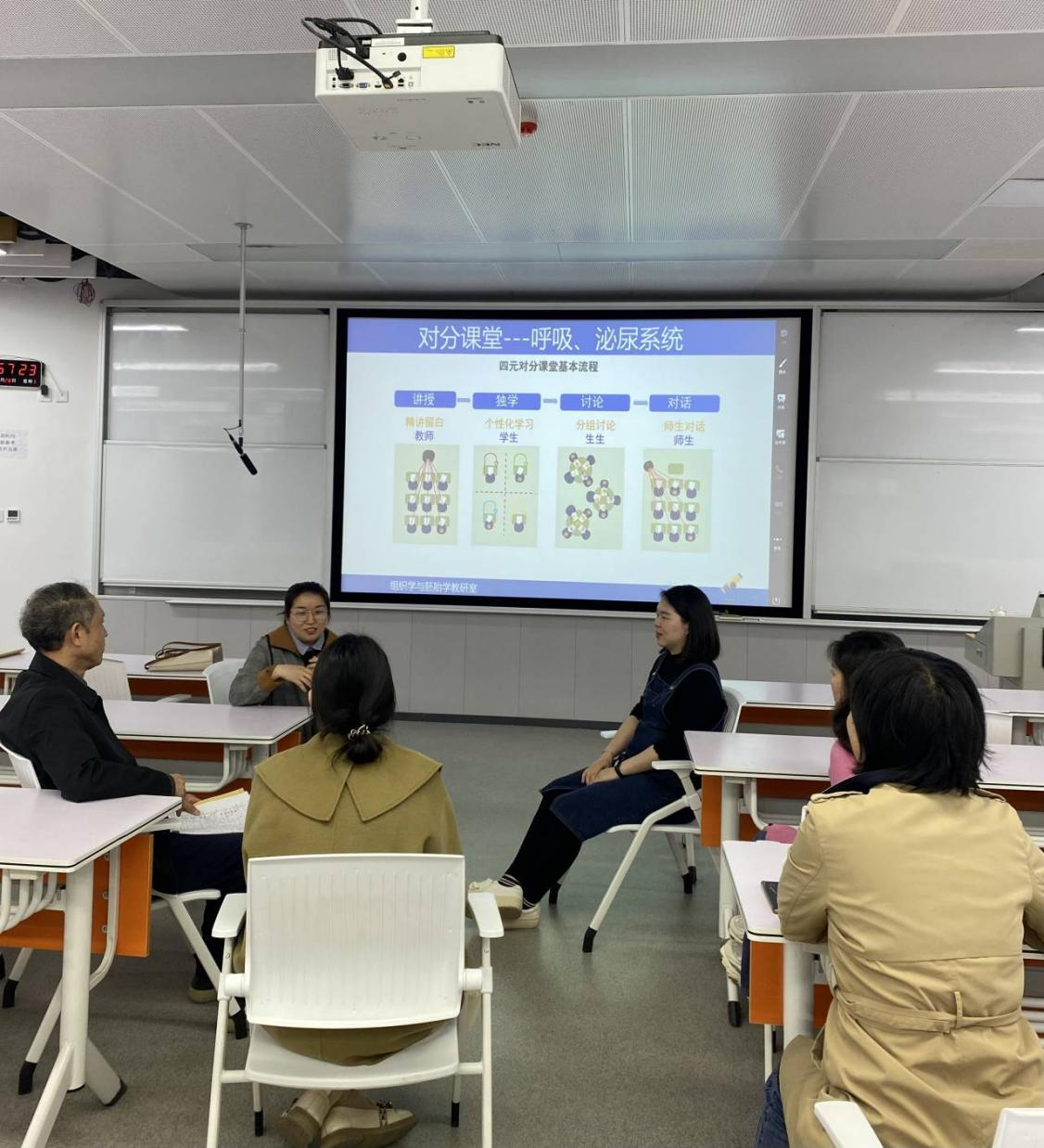 在对分课的内化讨论环节,学生在课堂上进行个性化学习,完成对分课堂学习内容的内化吸收。课堂中随机分组,每人以“亮考帮”的形式进行小组讨论。讨论中教师巡视课堂,了解学生讨论情况;随后进行师生对话,学生积极举手发言,交换小组成果,碰撞思想交流的火花,营造良好的集体学习氛围。听课老师在课后充分肯定了本次示范性教学活动的引领作用,一致认为对分课堂组织的很好,充分发挥了学生的主动性,给学生带来了个性化学习、深度学习和创造性学习的体验,学生课堂学习氛围十分活跃,教师课堂把控能力强、讲授清晰,具有高阶性、创新性和一定的挑战度。