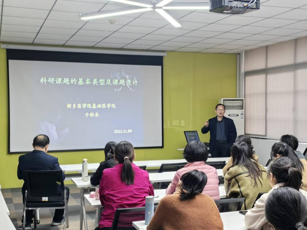 为营造我院科研学术氛围,不断培养高校教师自主创新科学素养,11月9日下午,我院邀请新乡医学院基础医学院副院长、第三附属医院副院长、第三附属医院病理科主任千新来教授在励学楼A304作专题讲座。讲座由基础医学院院长杨保胜主持,副院长李勇莉、各教研室主任、我院全体教师及部分兄弟院系教师参加学习。