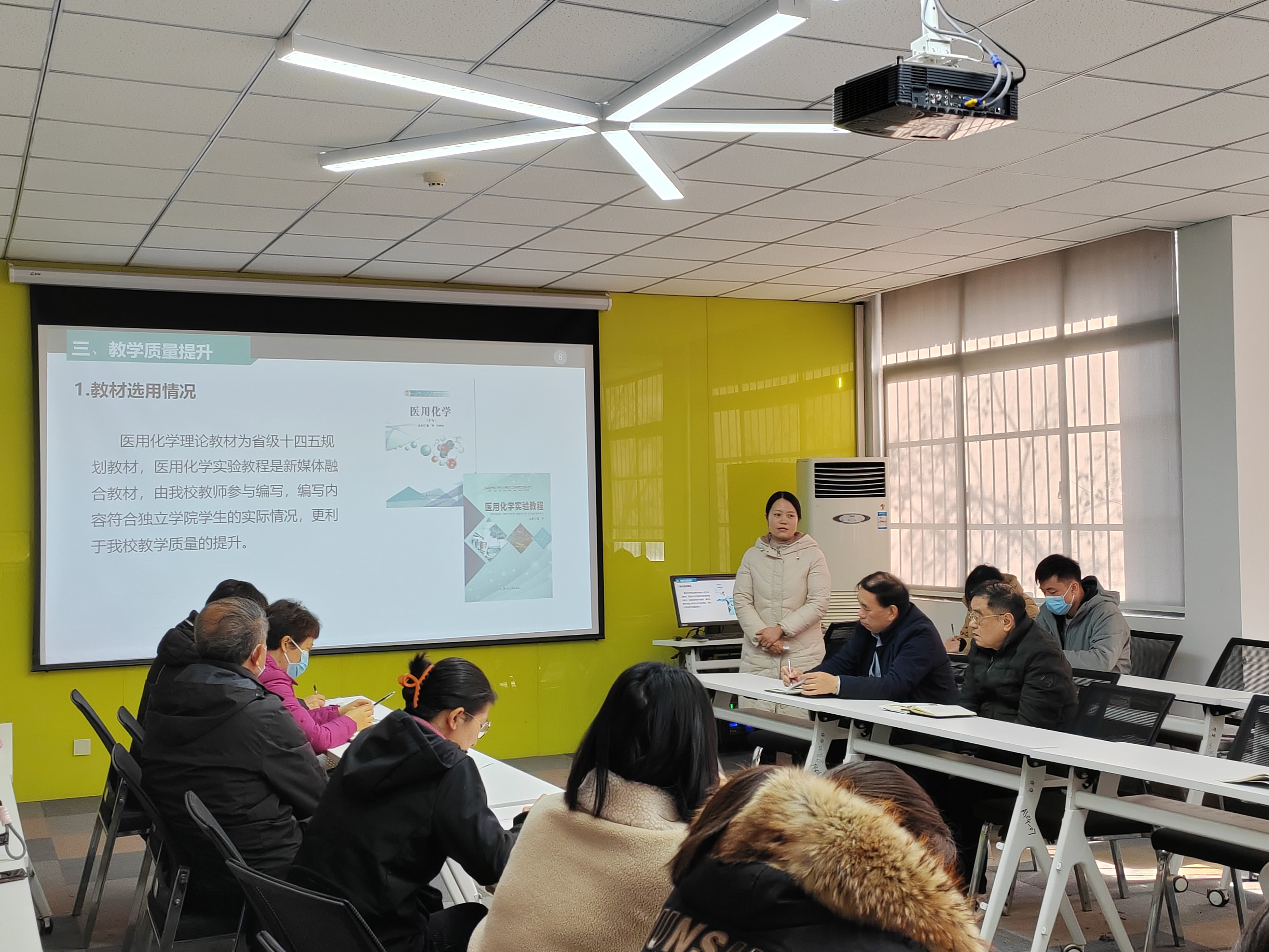 组织胚胎学教研室副主任刘晨曦从强师固本、抓实教改、指导学生参加全国大赛等方面介绍了教研室对临床医学、医学影像学专业教学质量提升所做的一系列工作,然后对学生的理论、实验成绩进行了系统分析和反馈。化学教研室副主任王秀菊对临床医学、医学影像学专业《医用化学》课程试卷、考试成绩进行了分析,然后从教材选用情况、教学内容和师资选择、教学资源建设、教学模式改革等方面对教学质量提升工作进行了汇报。
