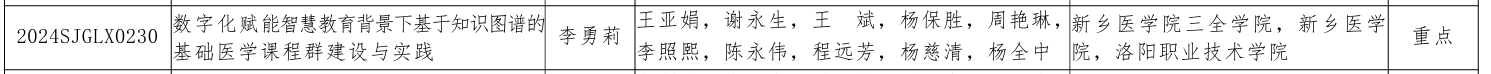 近日,河南省教育厅公布的2024年度河南省高等教育教学改革研究与实践立项项目的通知教高〔2024〕146号,我院李勇莉申报,王亚娟、谢永生、杨保胜等参与的《数字化赋能智慧教育背景下基于知识图谱的基础医学课程群建设与实践》获得重点项目立项。