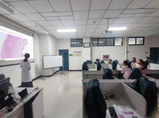 本次预试讲,从实战出发,模拟真实教学场景,特地安排在显微形态学实验室进行。两位新入职教师围绕组织学实验课首次课程四大基本组织展开。利用PPT和众茂云校虚拟形态学实验平台,从介绍显微镜使用到镜下观察,分别讲解了气管、食管、血涂片等几张标本中的基本组织成分和结构特点、功能,并且联系了临床病理变化。