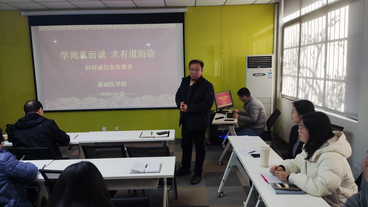 11月28日上午,由基础医学院组织的主题为“学尚真而诚,术有道而信”的科研诚信宣传教育活动在励学楼A304室举行基础医学院院长杨保胜、党总支副书记王林翮、副院长张慧英及我院教师参了加本次活动,张慧英副院长主持会议。