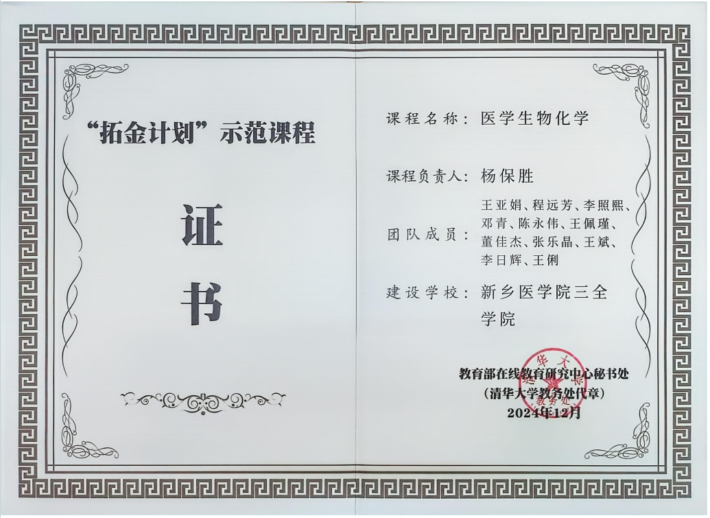 近日,教育部在线教育研究中心正式公布了2024年度“拓金计划”示范课程名单,我院的《医用化学》(课程负责人:郭亚萍)和《医学生物化学》(课程负责人:杨保胜)成功入选。这是对我院在医学教育领域长期不懈努力和卓越教学质量的高度认可。
