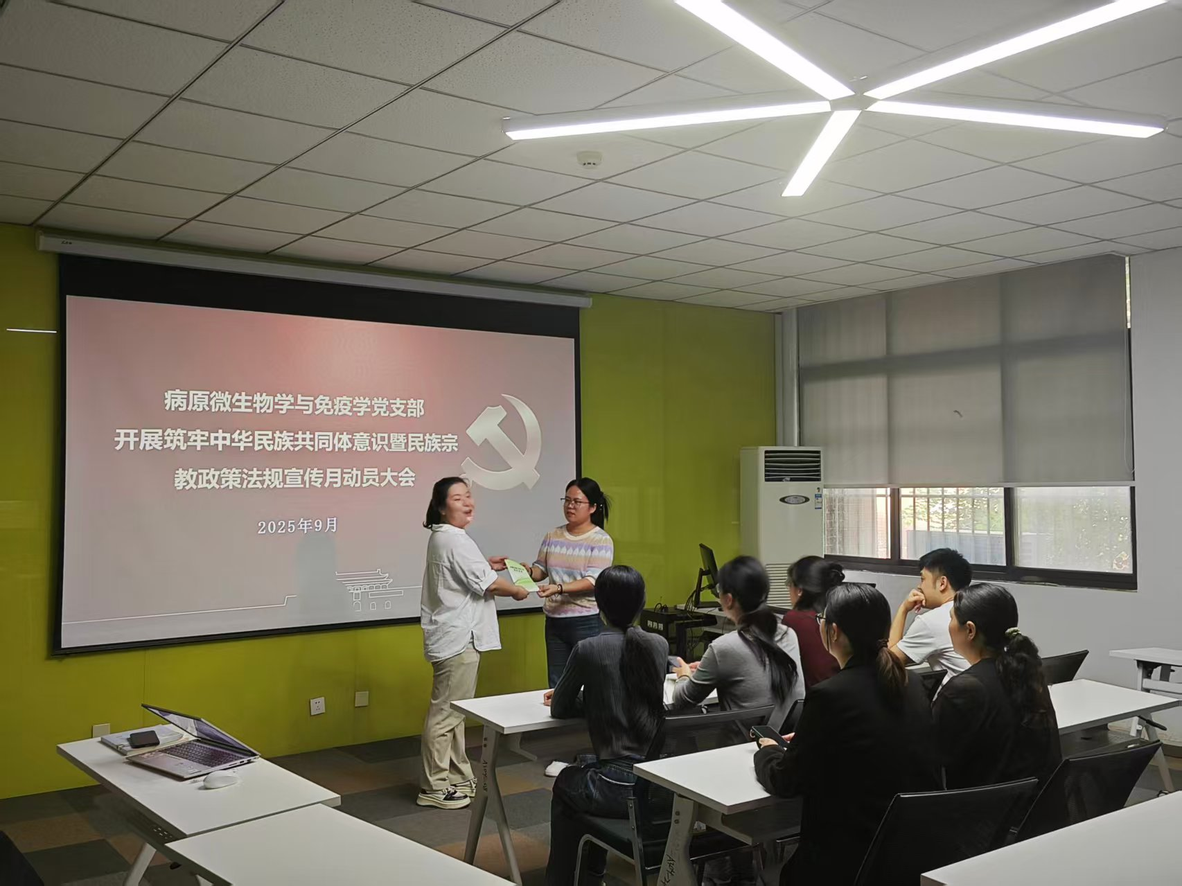 为深入贯彻落实中共河南省委宣传部、河南省民族宗教事务委员会《关于在全省高校开展铸牢中华民族共同体意识暨民族宗教政策法规宣传月活动的通知》,9月29日,病原生物学与免疫学党支部在励学楼A304开展筑牢中华民族共同体意识暨民族宗教政策法规宣传暨政治理论学习会议。会议由党支部书记周艳琳同志主持,支部全体党员教师参加。