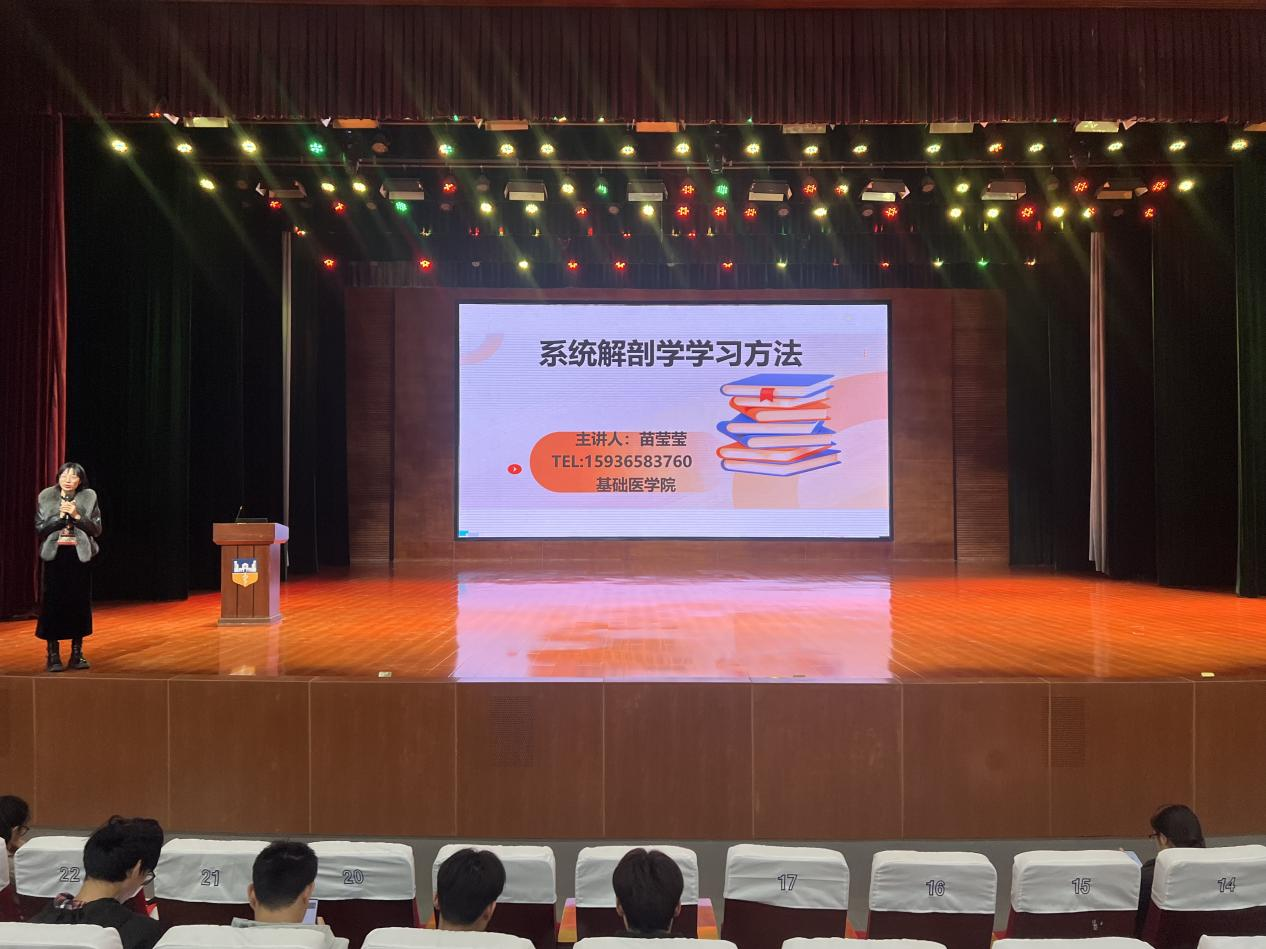 10月22日,基础医学院面向大一临床医学、医学影像学专业700余名新生,在闻德礼堂组织开展学习方法推广系列活动首场分享--《系统解剖学》学习方法介绍。活动由学院教务员龚宪宇主持,基础医学院党总支书记苗莹莹副教授担任主讲,旨在破解医学基础核心课程学习难点,帮助新生快速适应医学专业学习节奏。