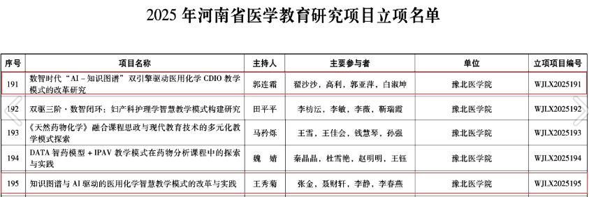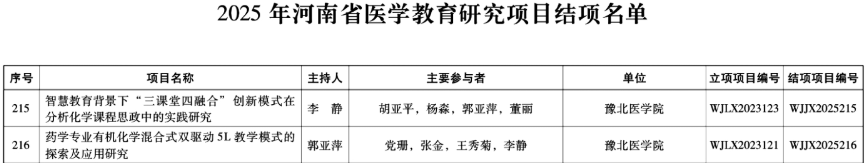 近日,河南省卫生健康委员会公布2025 年医学教育研究项目立项与结项名单,我院迎来好消息:郭连霜团队、王秀菊团队的项目成功立项,李静团队、郭亚萍团队的项目顺利结项。四项成果的成功立项及结项,不仅是省卫健委对学院基层教研工作的肯定,也体现了学院在医学教育改革与实践中的扎实探索。