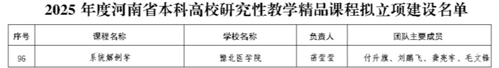近日,河南省教育厅公布2025年度本科高校精品课程立项名单,由基础医学院苗莹莹团队牵头建设的《系统解剖学》,成功获批“研究性教学精品课程”,这是团队深耕基础医学教学改革的重要成果,也彰显了学院在课程建设中的育人实力。