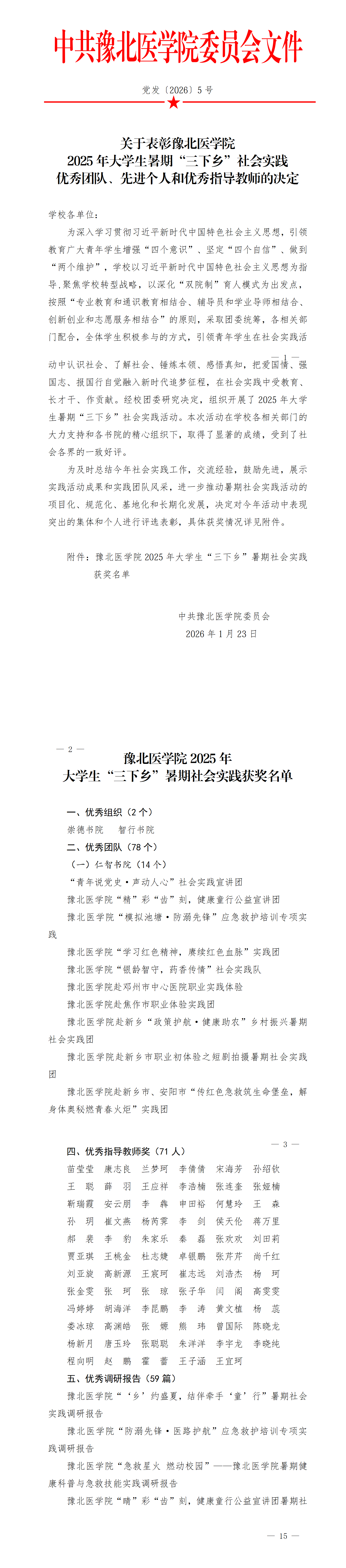 近日,中共豫北医学院委员会印发《关于表彰豫北医学院2025年大学生暑期“三下乡”社会实践优秀团队、先进个人和优秀指导教师的决定》(党发〔2026〕5号)。基础医学院在此次表彰中表现亮眼,苗莹莹老师荣获“优秀指导教师”称号,多名学子获评“先进个人”,充分展现了基础医学院师生在社会大课堂中的专业素养与责任担当。