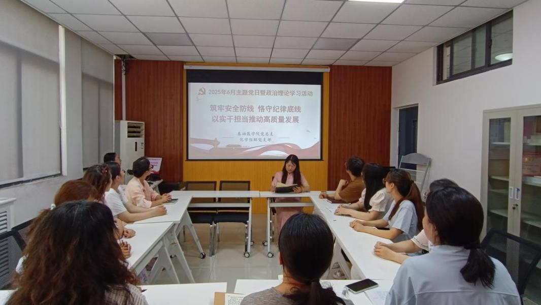 6月13日上午,基础医学院化学组胚党支部在励学楼A315开展以“筑牢安全防线 恪守纪律底线 以实干担当推动高质量发展”为主题的党日活动。此次活动由党支部书记王秀菊同志主持,支部全体党员参加。会议开始...