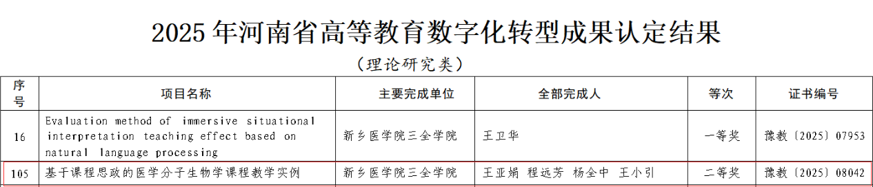 近日,河南省教育厅发布《关于公布2025 年度河南省高等教育数字化转型成果认定成果的通知》(教办科技〔2025〕143 号),基础医学院王亚娟团队凭借“基于课程思政的医学分子生物学课程教学实例” 项目,荣...